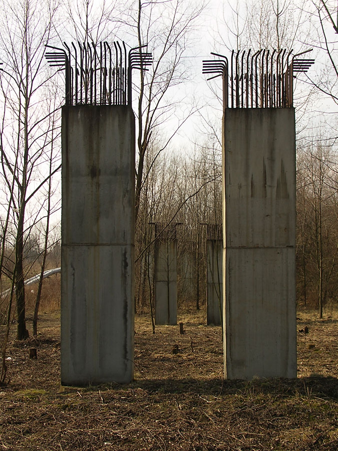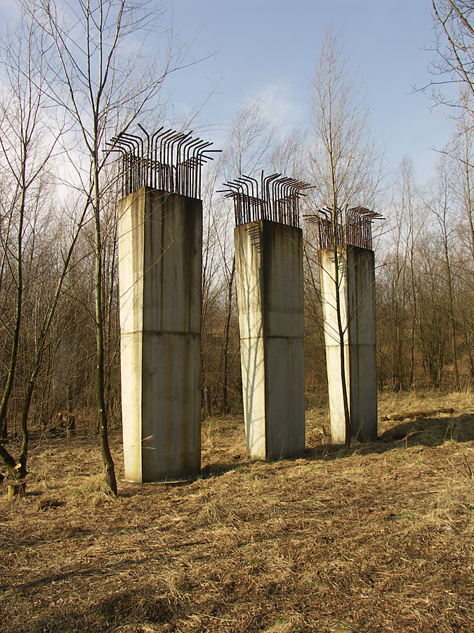 Dziewięć betonowych wsporników wiaduktu (po 3 sztuki w trzech rzędach) znajduje się powyżej ogródków działkowych idąc w górę ulicy Działkowej. Najprawdopodobniej miała na nich przebiegać droga do osiedla Bobrek Wschód, łącząca się z ulicą Zamarską, a następnie węzłem komunikacyjnym „Bobrek” z obwodnicą miasta. Zachowały się do dziś resztki drewnianych rusztowań.