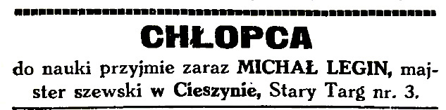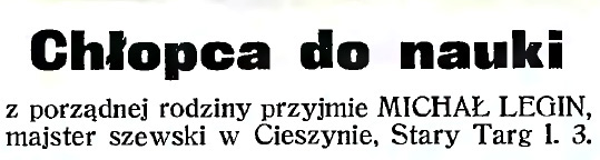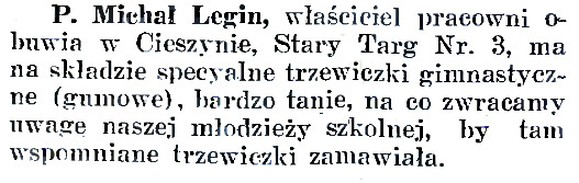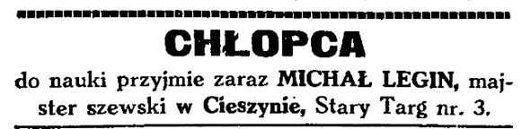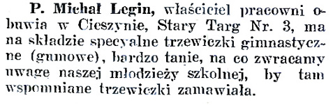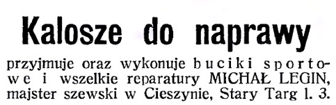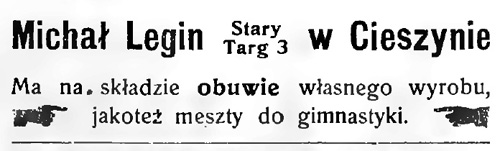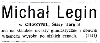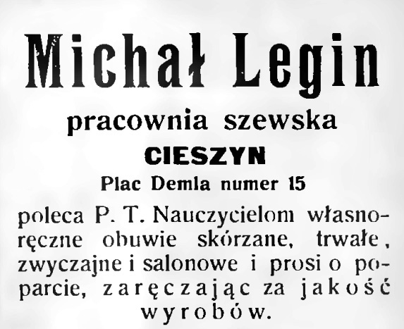 W 1904 działało w Cieszynie 67 szewców, zatem konkurencja była duża. Michał Legin wytwarzał i naprawiał obuwie męskie i damskie, meszty (półbuty do gimnastyki), a także buty nieprzemakalne (kalosze). Warsztat przenosił do kolejnych miejsc zamieszkania, ostatecznie od roku 1906 do kamienicy pod adresem Stary Targ 3.